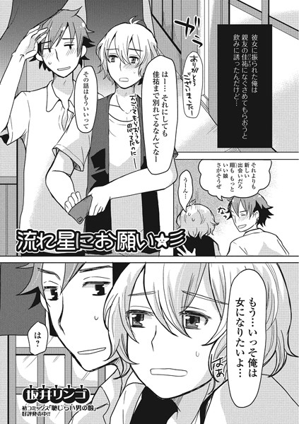一水社同時に彼女に振られた男の連れ2人。どうせなら俺が女になりたいよと、タイミング良く流れ星に願ってみたら、本当になっちゃった。俺ってば結構可愛くね?男の憧れ、裸エプロン♪とか連れを挑発してたら、その気になって襲って来やがった!でも女の身体って偉大だよなー。柔らかくて気持ちよくてサイコーだ!とゆわけで最後までやっちゃうのです。※この作品は「にょたいかダイナマイツ!4」に収録されている作品の単話配信です。