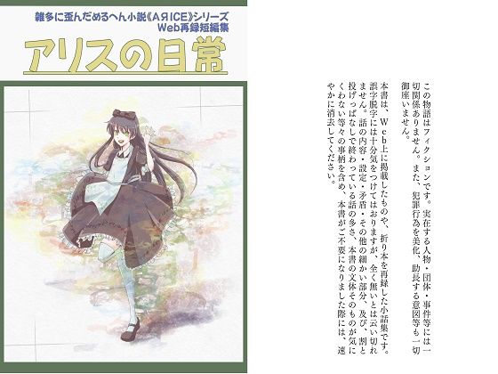これは、アリスとカレらの何気ない日常の物語。 雑多に歪んだめるへん小説《AЯICE》シリーズの小話として、Webに掲載していたものを一冊に纏めた再録集になります。 アリスの日常を切り取った小話集なので、何の脈絡もないまま始まり、オチも何もないまま終わる話や、チャシャとイチャコラしている話ばかりです。 読み切り作品15話入り/105頁/挿絵無し。 …